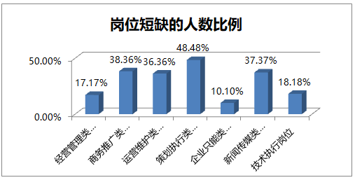 商務(wù)推廣、運(yùn)營維護(hù)、策劃執(zhí)行和新聞傳媒是人力最為短缺的部分