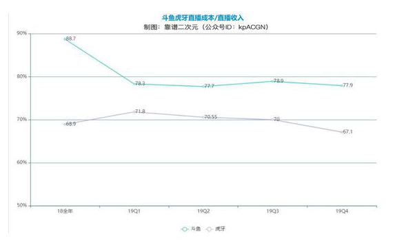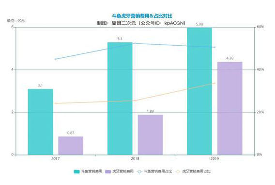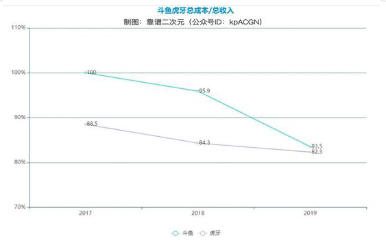 靠譜編輯部根據(jù)財(cái)報(bào)計(jì)算,2019年斗魚的總成本占比總收入,由前兩年的100%,95.9%逐年降低到83.5%,與虎牙82.3%的成本占比差距逐漸縮?。恢辈コ杀菊急纫矎?8年88.7%降低到78.3%,甚至連營(yíng)銷費(fèi)用都只比去年多了7000萬(wàn),占比從52.4%降為50.6%。