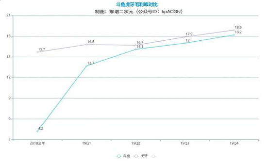 重直播,降成本,增營(yíng)收,沿著虎牙的軌跡斗魚做到了降本增效,根據(jù)財(cái)報(bào)數(shù)據(jù),斗魚毛利率在2019年從Q1的13.7%,在Q4增長(zhǎng)到18.2%,與虎牙Q4毛利率僅相差0.7%。2018年斗魚全年毛利率為4.2%,虎牙是15.7%。