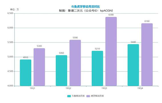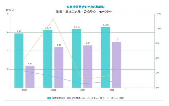 從2019年Q2開始,斗魚和虎牙的月活增速大幅降低,斗魚后兩季度整體月活環(huán)比增速僅為1.05%,虎牙則是2.05%?;⒀繯4移動(dòng)月活甚至比Q3減少了220萬(wàn)。