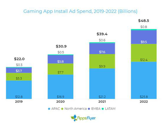 據(jù)AppsFlyer的分析,游戲領(lǐng)域的應(yīng)用安裝廣告消費(fèi)總額在2019年達(dá)到了220億美元之巨,并預(yù)計(jì)到2022年,游戲應(yīng)用營銷者在全球范圍內(nèi)的買量成本將達(dá)到485億美元。