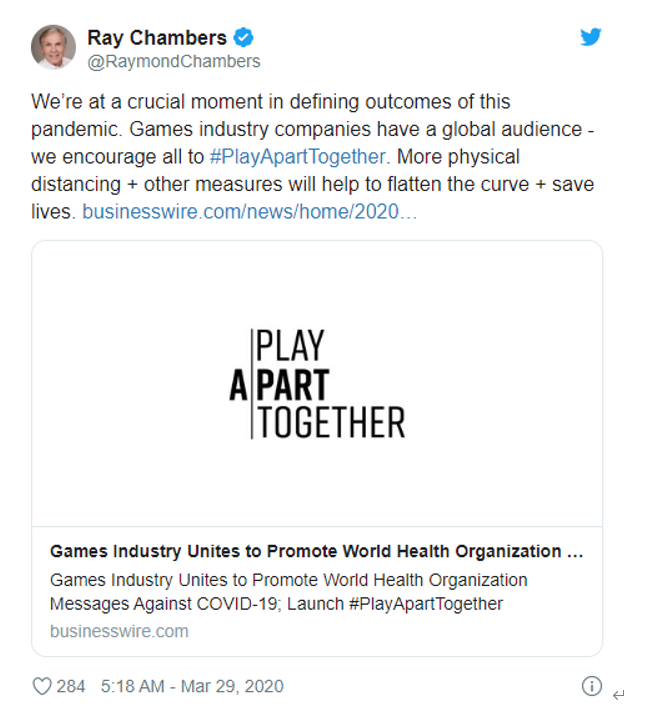 3月29日,世衛(wèi)組織全球戰(zhàn)略大使Ray Chambers在個人Twitter上發(fā)帖號召大家通過在家玩游戲的方式來保持隔離,以戰(zhàn)勝疫情。
