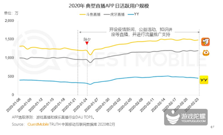 根據(jù)QuestMobile發(fā)布的《中國移動直播行業(yè)“戰(zhàn)疫”專題報告》中的數(shù)據(jù)顯示,由于假期以及疫情的影響,斗魚、虎牙等直播平臺的日活量自春節(jié)后均有所提升。