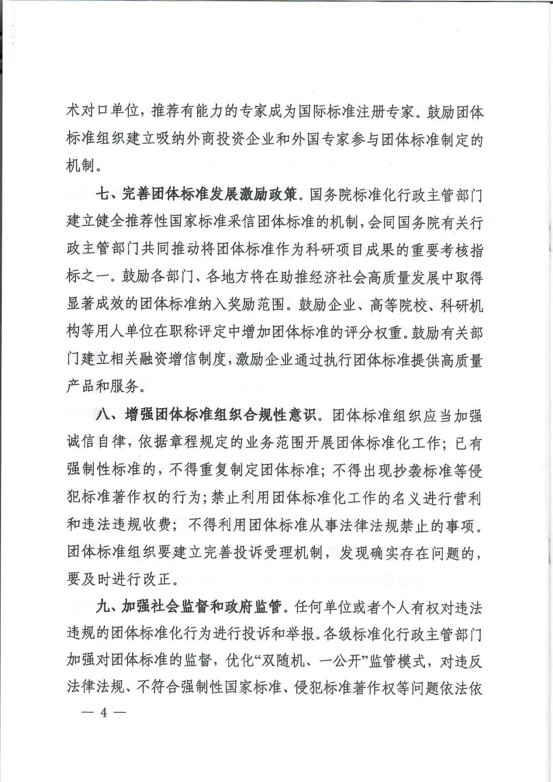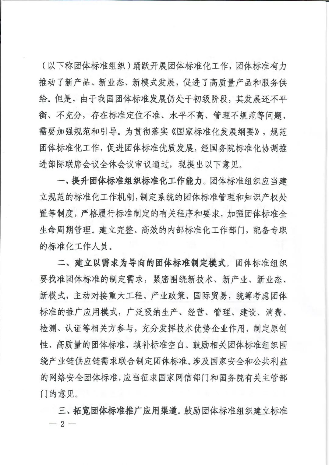 為貫徹落實《國家標準化發(fā)展綱要》,規(guī)范團體標準化工作,促進團體標準優(yōu)質發(fā)展,經國務院標準化協(xié)調推進部際聯(lián)席會議全體會議審議通過,國家標準化管理委員會等十七部門聯(lián)合印發(fā)了《關于促進團體標準規(guī)范優(yōu)質發(fā)展的意見》。