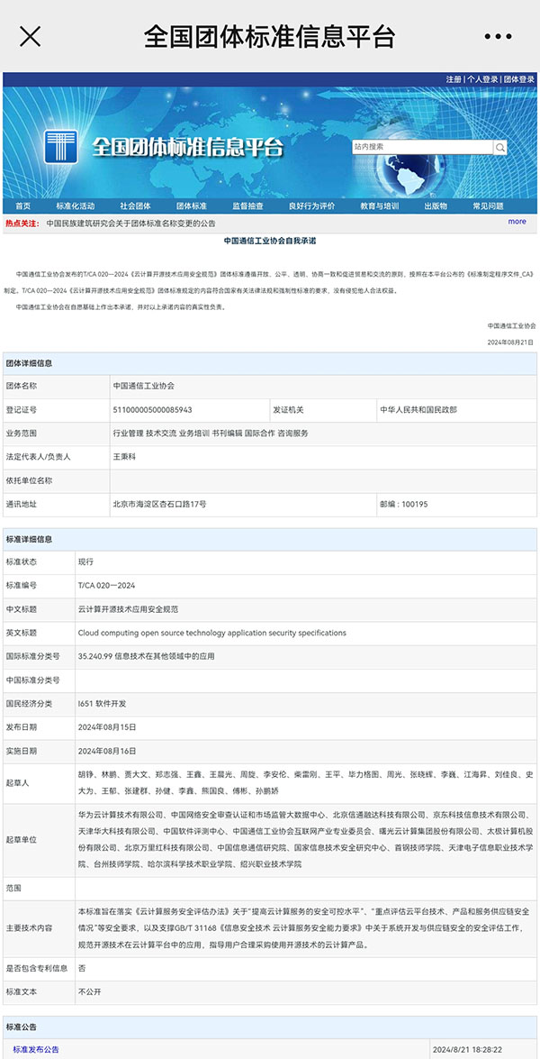 近日,由我會(huì)牽頭研制的《云計(jì)算開(kāi)源技術(shù)應(yīng)用安全規(guī)范》團(tuán)體標(biāo)準(zhǔn)在國(guó)家標(biāo)準(zhǔn)化管理委員會(huì)網(wǎng)站正式發(fā)布。