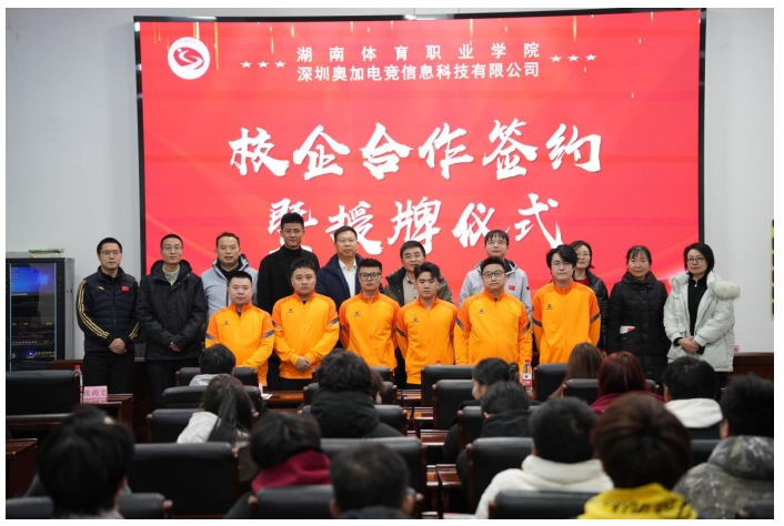 2025 年 2 月 24 日,簽約暨授牌儀式在湖南體育職業(yè)學(xué)院士官學(xué)院會議室隆重舉行。奧加電競集團(tuán)董事長徐勇、中國通信工業(yè)協(xié)會電子競技分會副秘書長、職業(yè)技能認(rèn)定平臺及電競?cè)瞬艛?shù)據(jù)庫負(fù)責(zé)人高月江、奧加電競俱樂部總經(jīng)理許澤西、奧加電競俱樂部教練洪澤楷等俱樂部選手以及湖南體育職業(yè)學(xué)院黨委副書記、副院長彭慶文,科技與社會服務(wù)處處長馮晴,數(shù)體學(xué)院院長柳軍等校方領(lǐng)導(dǎo)和 2024 級電子競技運(yùn)動與管理專業(yè)全體師生共同出席了此次儀式。