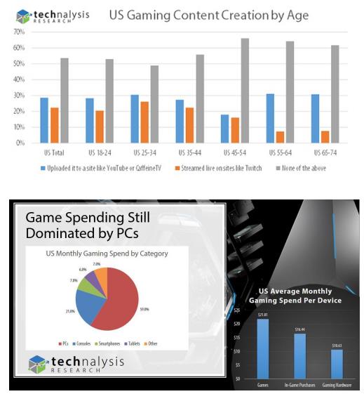 更為重要的是,一大群游戲玩家表示他們會通過直播或者上傳錄制的視頻來創(chuàng)建游戲內(nèi)容。而且在中國地區(qū),PC版游戲受歡迎程度要高于美國。從下面的兩張圖表中可以看到,接近一半的美國受訪者(數(shù)字超過100%,是因為有些玩家既在線直播也上傳內(nèi)容)會制作原創(chuàng)內(nèi)容,而在中國祇有不到40%的玩家沒有嘗試過。而且非常有趣的是,游戲并非是千禧一代的專利,中國和美國年齡段在35-44歲創(chuàng)作原創(chuàng)內(nèi)容的熱度非常高。
