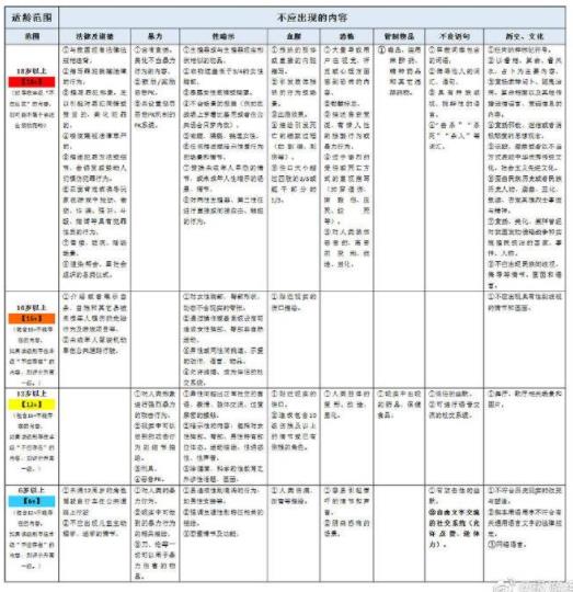 針對18歲以下不應(yīng)出現(xiàn)的內(nèi)容,現(xiàn)設(shè)有兩種方案:方案一粗略劃分為“18歲以下”,后續(xù)逐步細(xì)化;方案二分為“16+、12+、6+”三個級別。18歲以下每一級別均包含上一級別不能存在的內(nèi)容(例如:16+也不能出現(xiàn)酒類、煙草、毒品等),如果該級別存在本級不應(yīng)存在的內(nèi)容,則適齡評價升高一級。