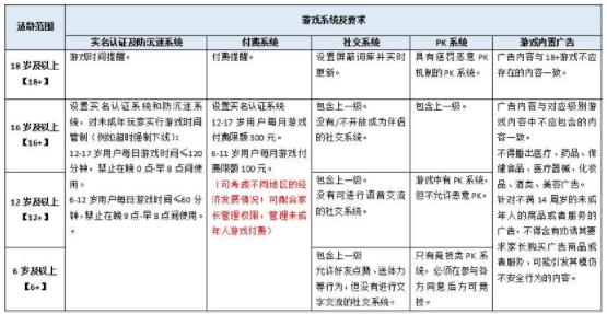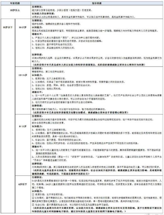 根據(jù)中國現(xiàn)行法律規(guī)定和青少年成長過程中的生理特征、認(rèn)知能力、道德水平綜合考慮,將游戲適齡范圍劃分為“18歲以上(18+)”“16歲以上(16+)”“12歲以上(12+)”“6歲以上(6+)”四級。因6歲以下兒童正處于視力發(fā)育等的關(guān)鍵時期,不建議他們單獨(dú)使用電子產(chǎn)品進(jìn)行游戲。