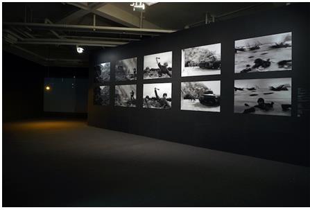 此外,展覽中與戰(zhàn)爭(zhēng)主題相關(guān)的作品還有肯特?希里的作品《DoD(勝利之日戰(zhàn)爭(zhēng)新聞學(xué))》。藝術(shù)家改編了游戲代碼,以記者的身份在二戰(zhàn)游戲“勝利之日”(DoD)中捕捉?jīng)_突的照片(以攝影鏡頭替代搶),以此進(jìn)行了一系列“戰(zhàn)地記者”的任務(wù)??咸?希里并不否認(rèn)他的作品和新聞?dòng)螒?News-game)之間的關(guān)系,早在2009年他已經(jīng)開(kāi)始用游戲引擎處理真實(shí)的二戰(zhàn)記錄照片。在展覽中,我們可以看到肯特?希里所“拍攝”虛擬的照片和戰(zhàn)地?cái)z影師羅珀特?卡帕真實(shí)的攝影并置。