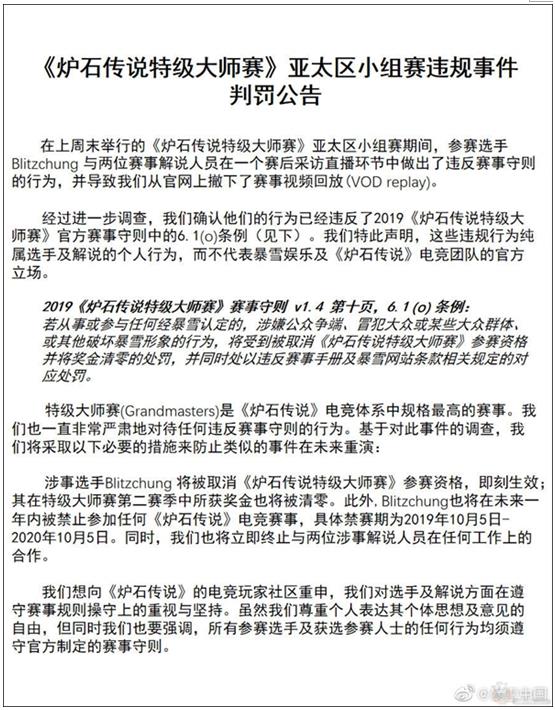 國慶節(jié)剛剛結(jié)束,對于國內(nèi)比較關(guān)注電競的玩家而言,《爐石傳說》比賽中香港選手blitzchung在采訪時發(fā)表不當(dāng)言論的事件想必都有所耳聞。由于事件情節(jié)十分惡劣,暴雪也是第一時間將其禁賽、沒收獎金,并發(fā)表了嚴(yán)正聲明。