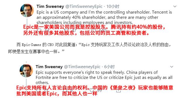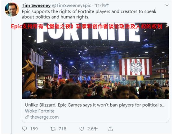 暴雪此舉在國內(nèi)贏得了一片叫好,不過也遭受了國外游戲圈的諸多質(zhì)疑。Epic公司的老總Tim Sweeney在今日接受外媒TheVerge詢問時,公開在推特回應(yīng)稱:“Epic支持所有《堡壘之夜》玩家和創(chuàng)作者談?wù)撜渭叭藱?quán)的權(quán)利。”