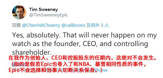 然而讓人遺憾的是,原本與這些事情無關(guān)的Epic Games首席執(zhí)行官卻非得把火往自己和自己公司身上引,有外國網(wǎng)友向其提問:“如果Epic遇見這種事情會怎么做?畢竟是騰訊40%持股的公司?!?