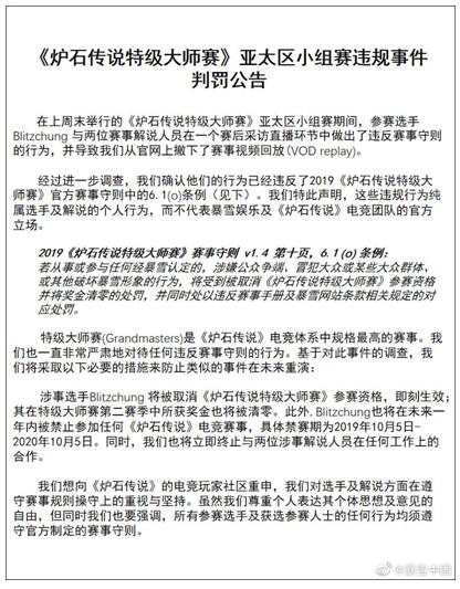 這種行為已經(jīng)觸及中國社區(qū)的底線,網(wǎng)易暴雪及暴雪中國方面在交涉了一天后終于發(fā)出正式公告,將blitzchung移除特級大師之列并禁賽一年,同時也不再與易先生和偷米這兩位當(dāng)晚的解說進(jìn)行更多合作。另外,爐石繁中頻道也已于當(dāng)晚把所有相關(guān)的視頻錄像下架。
