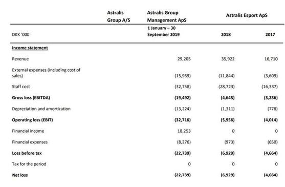 Astralis Group上市前尚未盈利,2019年1-9月收入為2920.5萬(wàn)丹麥克朗(約合人民幣3046萬(wàn)元),凈虧損為2273.9萬(wàn)丹麥克朗。2018年該公司收入為3592.2萬(wàn)丹麥克朗(約合人民幣3747萬(wàn)元),去年凈虧損為692.9萬(wàn)丹麥克朗。