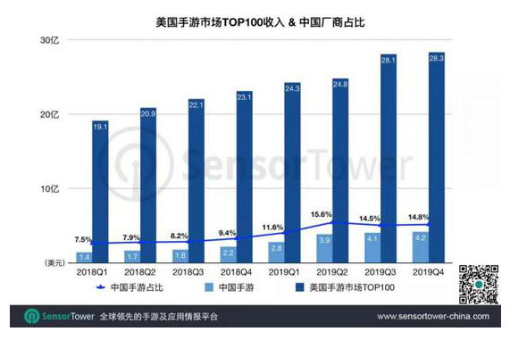 Sensor Tower商店情報(bào)數(shù)據(jù)顯示,美國(guó)作為海外最大的手游市場(chǎng),2019年Q4收入小幅增長(zhǎng),達(dá)到43億美元。在美國(guó)市場(chǎng)收入Top100手游中,中國(guó)手游數(shù)量進(jìn)一步上升至18款,收入4.2億美元,占Top100總收入的14.8%,較去年Q4增長(zhǎng)92.6%。詳細(xì)數(shù)據(jù)如下。