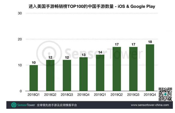 進(jìn)入美國(guó)市場(chǎng)收入TOP100的中國(guó)手游增加1款至18款,合計(jì)貢獻(xiàn)4.2億美元,較Q3微幅增長(zhǎng),同比上漲92.6%。