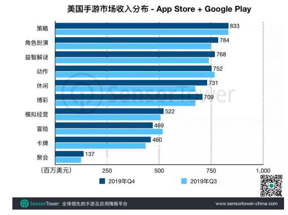 Q4策略手游在美國(guó)市場(chǎng)的收入為8.3億美元,雖然仍處于領(lǐng)先地位,但增長(zhǎng)幾乎停滯。相反,其它多數(shù)品類收入呈現(xiàn)上漲。其中,休閑和博彩手游的增幅最高,分別為8.5%和5.2%。休閑游戲的增長(zhǎng)主要來(lái)自《金幣大師》,《糖果粉碎傳奇》和《夢(mèng)幻花園》。頭部博彩游戲多數(shù)保持超過(guò)10%的環(huán)比增長(zhǎng)。這兩個(gè)品類的市場(chǎng)表現(xiàn),顯示出女性手游玩家仍是美國(guó)市場(chǎng)的增長(zhǎng)主力。