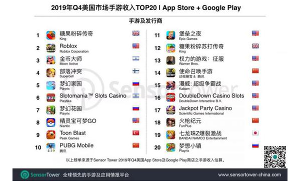 Q4美國(guó)手游暢銷榜中,榜首冠軍仍是《糖果粉碎傳奇》。這款上市超過(guò)7年的長(zhǎng)壽手游,在本季度收入再次出現(xiàn)上漲,環(huán)比增幅達(dá)到11%。
