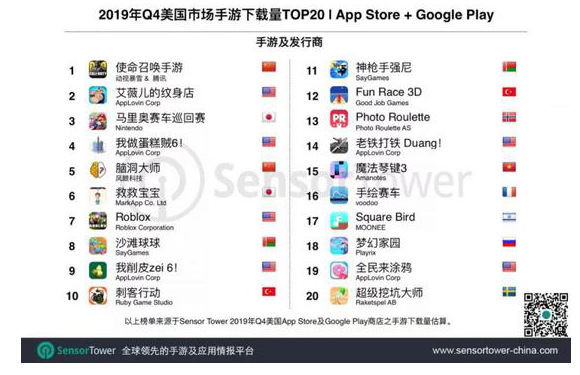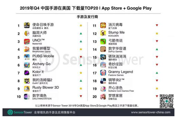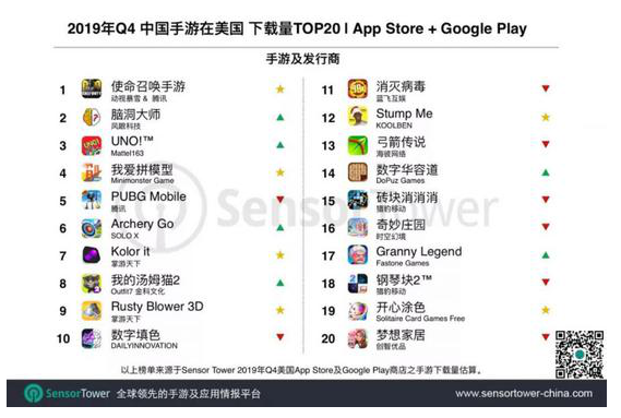 下載榜上,Top20手游中新品共有6款,較Q3增加1款。除《使命召喚手游》外,其它均為休閑或益智解謎游戲。