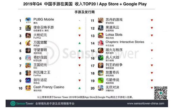 具體到中國(guó)手游收入榜,盡管《使命召喚手游》在10月上市并獲得大量玩家,Sensor Tower商店情報(bào)數(shù)據(jù)顯示《PUBG Mobile》Q4收入表現(xiàn)穩(wěn)健。本期《PUBG Mobile》在美國(guó)吸金近5200萬(wàn)美元,《使命召喚手游》緊隨其后吸金近4800萬(wàn)美元。兩款游戲無(wú)疑將競(jìng)技手游在美國(guó)的市場(chǎng)份額進(jìn)一步擴(kuò)大。除此之外,首次入圍榜單的還有博樂(lè)科技旗下《Cash Frenzy Casino》。