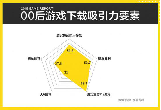 同人內(nèi)容是促成游戲下載的重要因素。在“以下什么方式會(huì)吸引你下載一款游戲?(可多選)“問題下,68.9%的00后選擇“游戲宣傳片/海報(bào)吸引“,56.3%選擇“感興趣的同人作品”,“朋友安利”的影響力為53.7%,之后是榜單推薦和大v推薦,分別占比37.8%和21%。