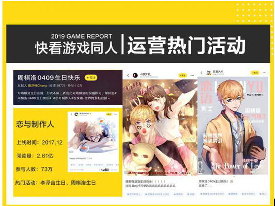 上線于2017年12月的《戀與制作人》是當(dāng)年的現(xiàn)象級(jí)手游,直到今天,它仍保持著旺盛的生命力,在這個(gè)過程中同人運(yùn)營功不可沒?!稇倥c制作人》的同人運(yùn)營大多圍繞四位主角展開,借鑒了很多娛樂圈的玩法,比如為四位主角慶生已經(jīng)成為每年的保留項(xiàng)目。目前,《戀與制作人》話題頁閱讀量為2.61億。