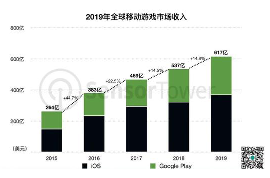 Sensor Tower 商店情報(bào)數(shù)據(jù)顯示,2019年全球移動(dòng)游戲在App Store和Google Play的預(yù)估總收入達(dá)到617億美元,較2018年增長14.8%。雖然增速較2015年和2016年有所放緩,但全球移動(dòng)游戲市場仍處于快速增長階段。