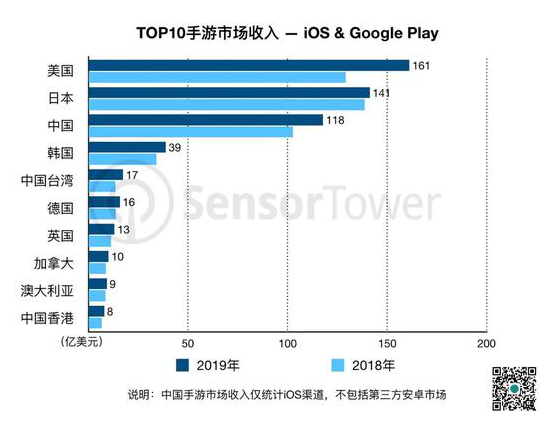 2019年,美國手游市場的收入超越日本,成為除中國以外,收入最高,增長最快的市場。