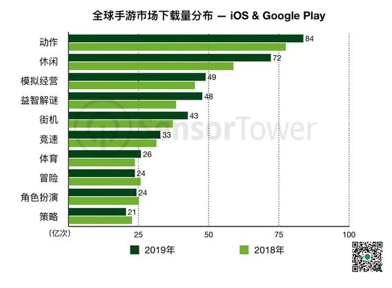 下載量方面,雖然過去2年超休閑游戲在數(shù)量上統(tǒng)治全球手游下載榜頭部,但在《PUBG MOBILE》,《Garena Free Fire》,《使命召喚手游》,《地鐵跑酷》等商業(yè)大作的帶領(lǐng)下,動(dòng)作類仍是下載量最多的品類。