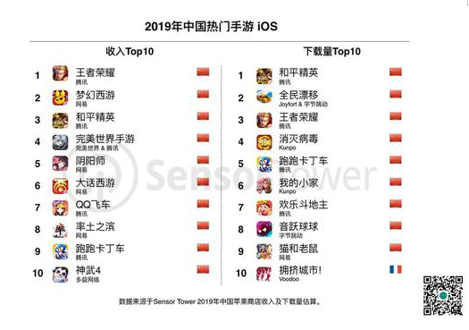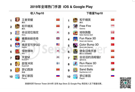 2019年,騰訊兩款手游包攬全球手游暢銷榜第1和第2名。其中,《王者榮耀》及海外版本全球預(yù)估收入超過14.8億美元,已連續(xù)兩年獲得全球手游收入冠軍。