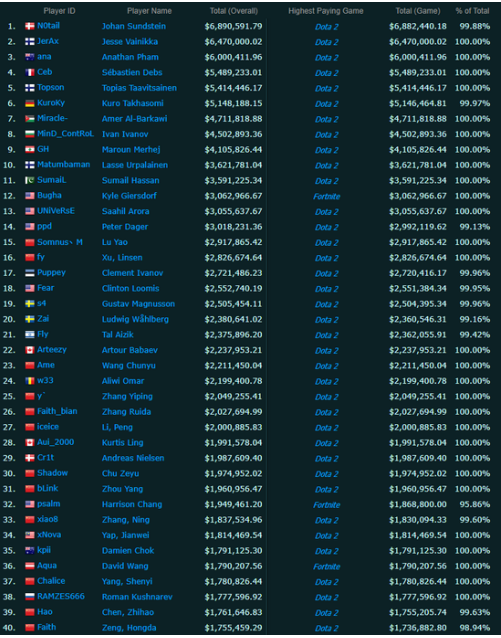 據(jù)DualShockers報(bào)道,電子競(jìng)技在娛樂(lè)行業(yè)越來(lái)越受青睞,電競(jìng)選手的收入也隨之水漲船高,2019年電競(jìng)選手的總收入合計(jì)達(dá)到了驚人的2.16億美元。根據(jù)EsportsEarnings的最新數(shù)據(jù),在全球歷史總收入最高的100名電競(jìng)選手中,只有10%是美國(guó)人,29%的選手來(lái)自中國(guó)。以下是榜單的詳情: