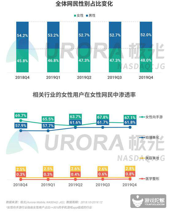 2019年,全體網(wǎng)民性別比例越來越均衡,女性網(wǎng)民占比在2019年Q4穩(wěn)步上升至48%,以女性用戶為主的相關(guān)行業(yè)App在女性網(wǎng)民中的滲透率也均有所增長。