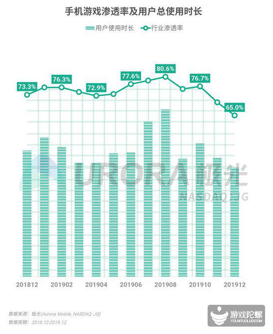 用戶總使用時(shí)長的趨勢與滲透率大體一致,年末手機(jī)游戲行業(yè)使用總時(shí)長創(chuàng)新低。
