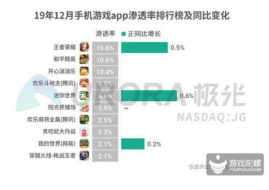 而在2019年12月手機(jī)游戲行業(yè)使用時(shí)長和滲透率都遇冷的情況下,手機(jī)游戲行業(yè)主要由《王者榮耀》、《和平精英》和《開心消消樂》三款游戲撐起大頭。其中,《王者榮耀》的滲透率為16.6%,正同比增長0.5%,穩(wěn)居行業(yè)第1。