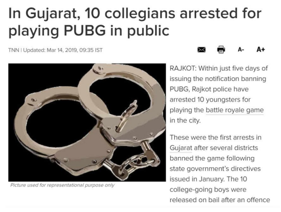 據(jù)“印度時報(bào)”網(wǎng)站報(bào)道,近日印度古吉拉特邦的警察逮捕了十名大學(xué)生,理由是他們十個人在公共場所聚眾玩“吃雞”這款手游(指手機(jī)游戲PUBG)。據(jù)印度時報(bào)報(bào)道,印…