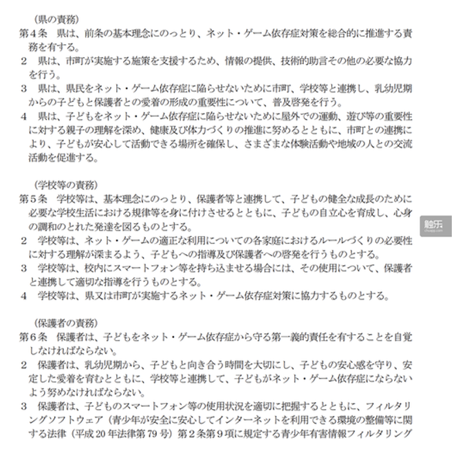從內(nèi)容中可以看出,香川縣議會在《條例》中體現(xiàn)的重點之一,是劃分政府、學校、監(jiān)護人、游戲廠商、電信運營商、相關(guān)行業(yè)從業(yè)者的責任。