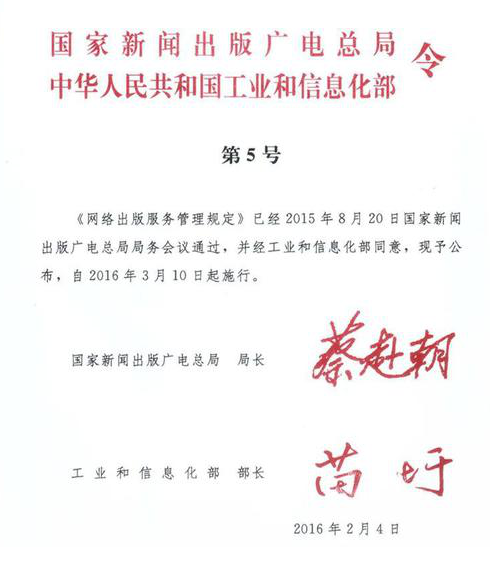 2月4日,國家新聞出版廣電總局和工業(yè)和信息化部發(fā)布《網(wǎng)絡(luò)出版服務(wù)管理規(guī)定》。其中規(guī)定網(wǎng)絡(luò)游戲上網(wǎng)出版前,必須向所在地主管部門提出申請,經(jīng)審核同意后,報廣電總局審批。