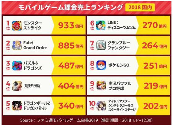 2018年《荒野行動》收入在日本市場排名第四