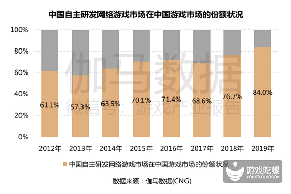從2012年起,中國自主研發(fā)游戲的收入,不僅承擔起了國內(nèi)游戲市場實際銷售收入增長的大部分增量,更是占據(jù)了國內(nèi)市場的過半份額,2019年占比攀升至84.0%。