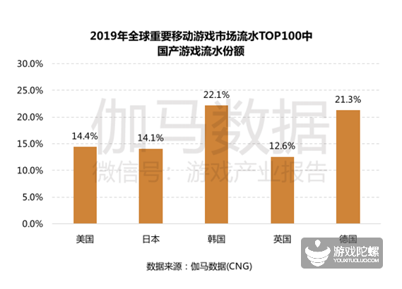 中國自主研發(fā)游戲中,移動游戲在全球頭部市場中極具競爭優(yōu)勢。2019年全球重要移動游戲市場流水TOP100中,韓國市場的中國產(chǎn)游戲流水份額占比最高,為22.1%;其次為德國、美國、日本和英國,各自占比21.3%、14.4%、14.1%、12.6%。
