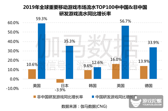 中國自研游戲在全球主要市場增幅大大領先于非國產(chǎn),在美國增長率高達59.3%