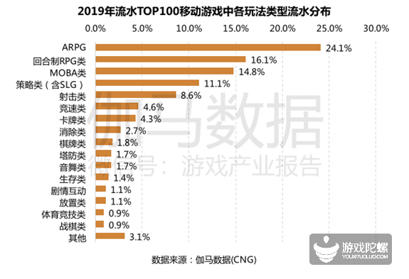 從玩法類型來看,2019年流水TOP100移動游戲中,ARPG類營收能力最強,流水占比達24.1%;MOBA類僅排第3,流水占比16.1%;射擊類第5,流水占比8.6%。