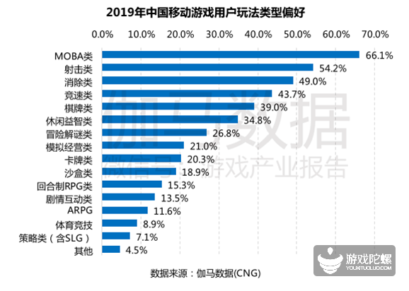 不過,中國移動游戲用戶玩法偏好榜中,MOBA和射擊類霸占前兩名,占比分別為66.1%和54.2%。玩法的人氣與整體流水表現(xiàn)并非正相關。