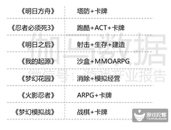 伽馬數(shù)據(jù)認為,不同類型的玩法融合或將成為突破口,這將是產(chǎn)品研發(fā)的重要機會,從而帶來用戶覆蓋面和付費水平的雙向提升,比如融合了塔防和卡牌的《明日方舟》。