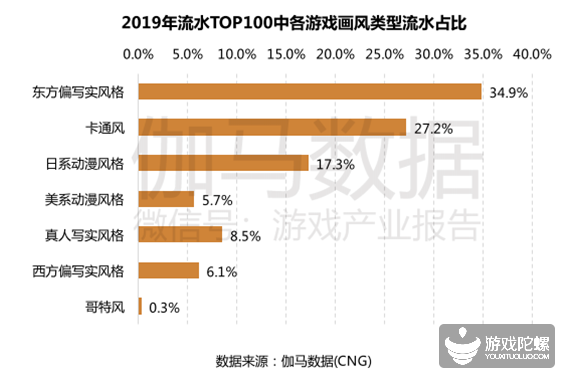 從畫風類型來看,2019年流水TOP100游戲中,東方偏寫實風格仍舊是中國玩家最喜歡的類型,占比高達34.9%,與西方偏寫實風格(6.1%)形成極大反差;日系動漫風流水占比17.3%,真人寫實風流水占比8.5%。
