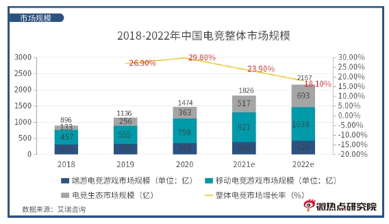 據(jù)艾瑞咨詢(xún)發(fā)布的《中國(guó)電競(jìng)行業(yè)研究報(bào)告》顯示,中國(guó)電競(jìng)市場(chǎng)仍保持著高速的增長(zhǎng),游戲市場(chǎng)和電競(jìng)生態(tài)市場(chǎng)不斷擴(kuò)張。截至2020年底,中國(guó)電競(jìng)整體市場(chǎng)規(guī)模1474億元,較上年增加338億元,同比增長(zhǎng)29.80%;預(yù)計(jì)2022年電競(jìng)市場(chǎng)整體規(guī)模將超過(guò)2100億元。