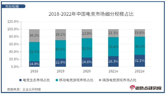 在電競(jìng)影響力及商業(yè)化的帶動(dòng)下,游戲直播、電競(jìng)陪練、電競(jìng)影視綜音等電競(jìng)衍生業(yè)態(tài)蓬勃興起,根據(jù)企業(yè)公開(kāi)年報(bào)可見(jiàn),中國(guó)電競(jìng)生態(tài)市場(chǎng)占比持續(xù)提高,預(yù)計(jì)2021年電競(jìng)生態(tài)將占據(jù)28.3%的電競(jìng)市場(chǎng)份額,行業(yè)潛力十足。