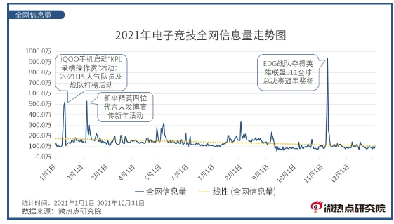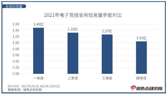 經(jīng)微熱點(diǎn)研究院統(tǒng)計(jì),2021年電子競(jìng)技行業(yè)全網(wǎng)信息量為5.14億條,其中一季度產(chǎn)生的信息量更高,經(jīng)了解,游戲品牌方、贊助方釋出的新年活動(dòng)、人氣隊(duì)員及戰(zhàn)隊(duì)票選活動(dòng)等引起廣泛關(guān)注與討論,產(chǎn)生較多網(wǎng)絡(luò)信息。