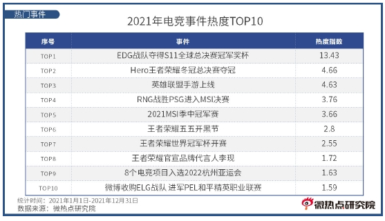從熱點(diǎn)事件也可以看出,2021年熱門(mén)電競(jìng)賽事推動(dòng)行業(yè)關(guān)注度提升。熱度TOP10事件中,與賽事相關(guān)事件占據(jù)七席,其中“EDG戰(zhàn)隊(duì)奪得英雄聯(lián)盟S11全球總決賽冠軍”關(guān)注度最高?!癏ero王者榮耀冬冠總決賽奪冠”引發(fā)熱議,以4.66的熱度指數(shù)排在榜單第二位。此外,“8個(gè)電競(jìng)項(xiàng)目入選2022杭州亞運(yùn)會(huì)”以1.63的熱度指數(shù)排在榜單第九位,可見(jiàn)電競(jìng)行業(yè)的發(fā)展、轉(zhuǎn)型點(diǎn)備受關(guān)注。